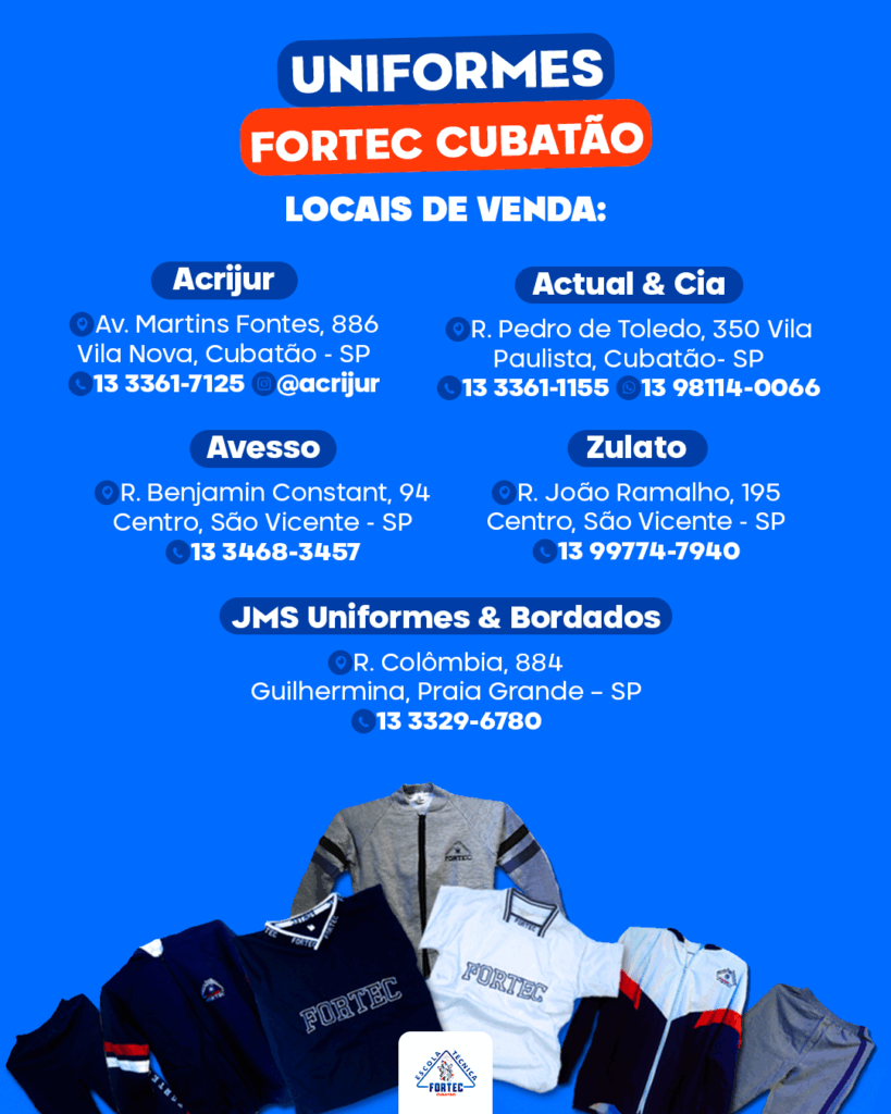 (13)3361-7300 Av. Nações Unidas, 956 - Cubatão Seg - Sex 7h30 às 23h00 Facebook-f Instagram Whatsapp Youtube A ESCOLA Nossa História Missão, Visão e Valores Diferenciais CURSOS Educação Infantil Fundamental I Fundamental II Ensino Médio Técnico Curso Técnico Especial INFORMAÇÕES Curso de Férias Lista de Material 2026 Volta às Aulas 2026 – Dias e Horários Circular de Direitos e Obrigações do Aluno Bolsista Confecção de Uniformes Portal Perseus A ESCOLA Nossa História Missão, Visão e Valores Diferenciais CURSOS Educação Infantil Fundamental I Fundamental II Ensino Médio Técnico Curso Técnico Especial INFORMAÇÕES Curso de Férias Lista de Material 2026 Volta às Aulas 2026 – Dias e Horários Circular de Direitos e Obrigações do Aluno Bolsista Confecção de Uniformes Portal Perseus Confecção de Uniformes Copyright © | Escola Fortec Cubatão desde 1983 formando gerações. Facebook-f Instagram Whatsapp Youtube